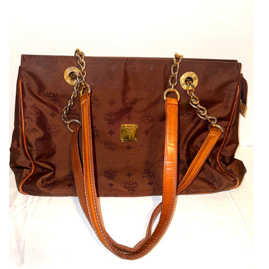 Vintage MCM Monogram Brown Nylon Chain Strap Tote Bag with Leather Trim