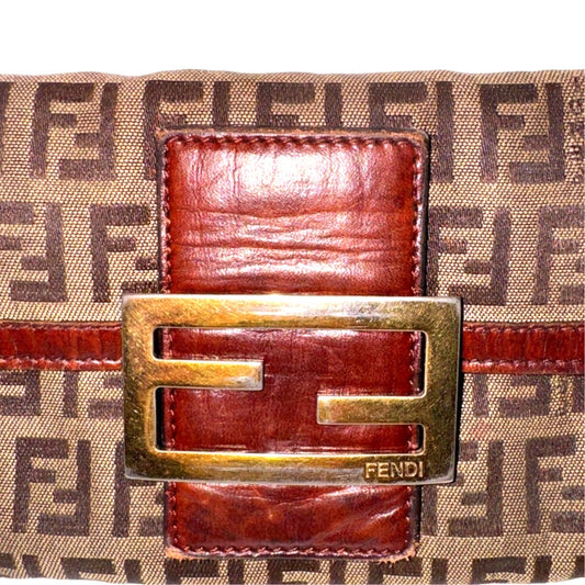 Authentic Fendi Zucca Baguette Wallet in Canvas and Leather with Gold Buckle